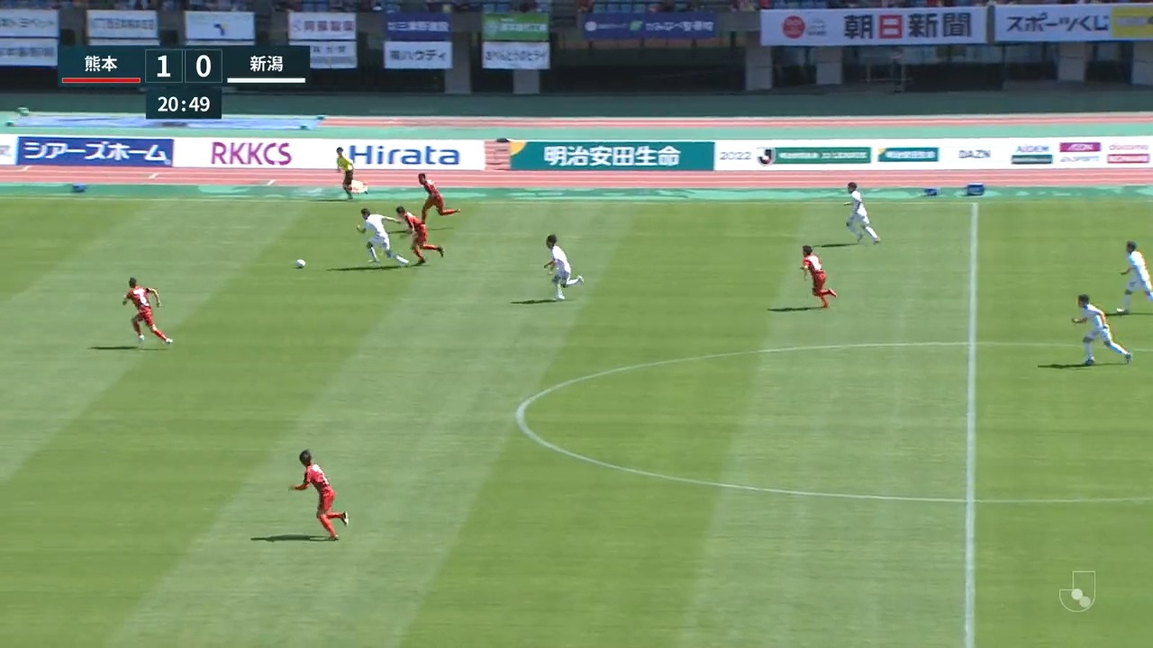 その後も熊本がボールを握るが、21分、中盤で自らボールを奪った新潟の谷口 海斗が30m超のロングシュートを決めて同点に。以降、新潟も逆転のチャンスを作るが、どちらにも2点目は生まれず前半を終えた。