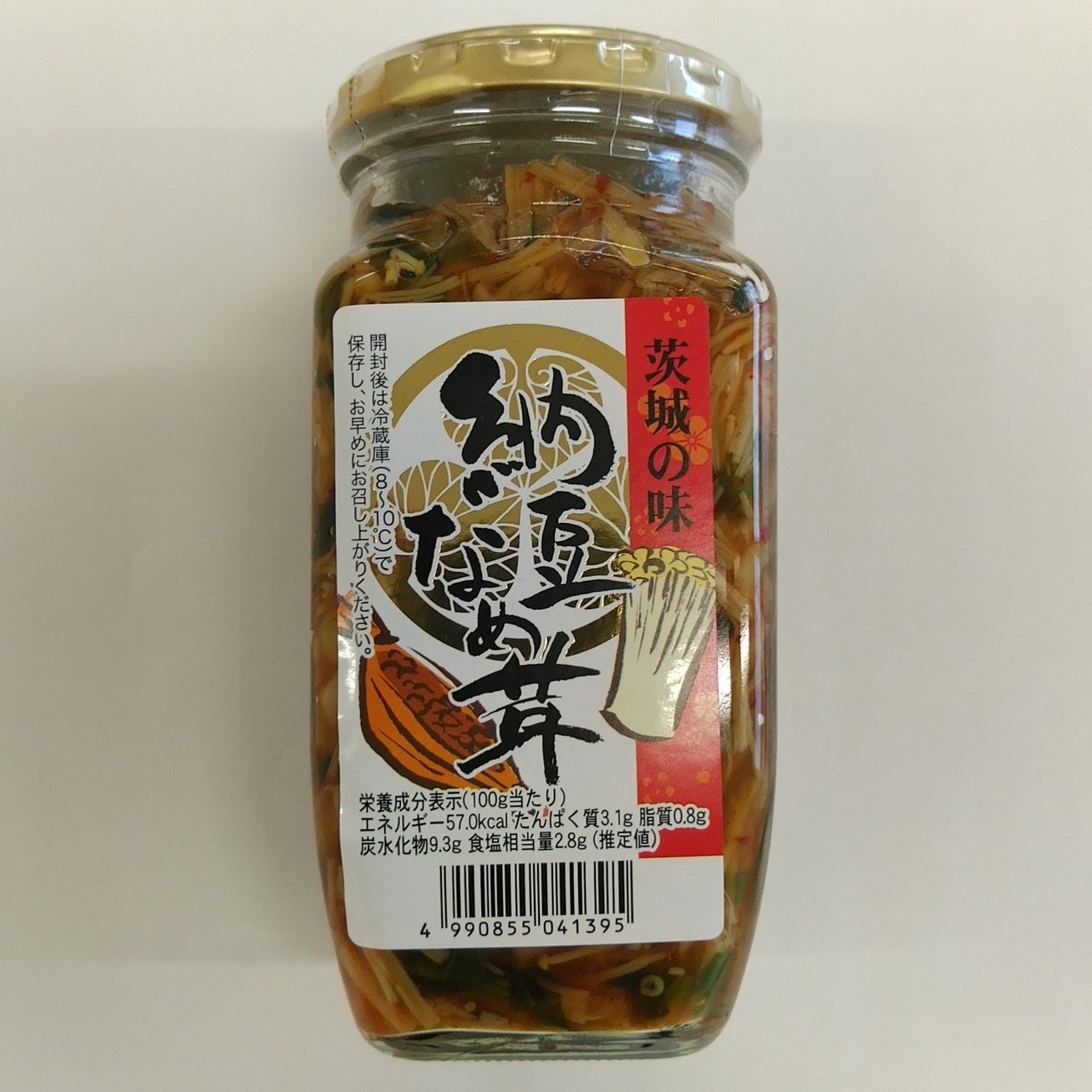 国産えのき茸、蒟蒻、きざみ野沢菜、唐辛子を使用したなめたけに納豆の本場茨城県産の干し納豆を混ぜ合わせた商品です。